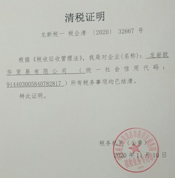 香港商人李先生是原深圳欧华高科有限公司法人代表,据他介绍:2020年,响应龙岩市新罗区招商引资,迁入龙岩市新罗区,成立龙岩市欧华贸易有限公司(下称:欧华公司)。同年 11 月 10 日,在新罗区税务局和龙岩市税务局稽查局的同意和指导帮助下,原龙岩欧华公司完成了注销前的所有税款申报,包括经营期企业所得税核定征收申报和清算期企业所得税申报。相关资料显示,附加税费纳税申报表的受理税务机关为龙岩市税务局稽查局,企业所得税申报表的经办人也是龙岩市稽查局人员,欧华公司于 2020 年 12 月正式注销,股票通过“非交易过户”方式转到李先生和李女士个人名下持有。值得注意的是本次稽查的主检查人员就是当时办理清税手续的人员。