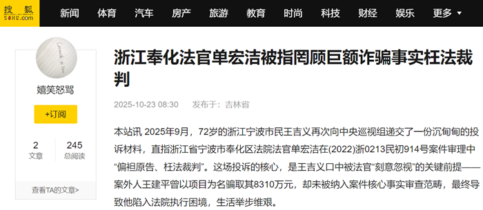 据悉,对于单宏洁作出的判决王吉义不服,但上诉后却遭到驳回,之后王吉义曾在2025年3月向宁波市中级法院提交书面投诉,举报单宏洁的枉法裁判行为,但未收到任何回复。“我现在面临奉化法院的执行,生活已经陷入困难,无处申冤才找巡视组。”王吉义在投诉材料中承诺,所述内容均真实,若有虚假愿承担法律后果。
