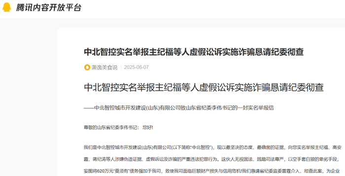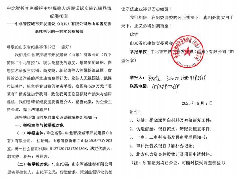 我们是中北智控城市开发建设(山东)有限公司(以下简称“中北智控”),现以最坚决的态度、最确凿的证据,向您实名举报主纪福、高安霞、蒋纪涛等人涉嫌伪造证据、虚假诉讼及诈骗的严重违法犯罪行为。这伙人无视国法、践踏司法尊严,以空手套白狼的卑劣手段,妄图将620万元“莫须有”债务强加于我司,致使我司面临巨额财产损失与信用危机!我们恳请省纪委监委雷霆介入、彻查此案,为企业主持公道,捍卫法律尊严!