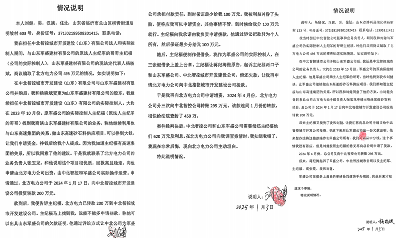 2024年1月17日,刘健以虚假项目申请,北方电力向我司划拨200万元经营款;2024年4月,主纪福以“伪造欠条、套取资金”为饵,唆使刘健再次申请追加295万元,我司账户累计资金达450万元。