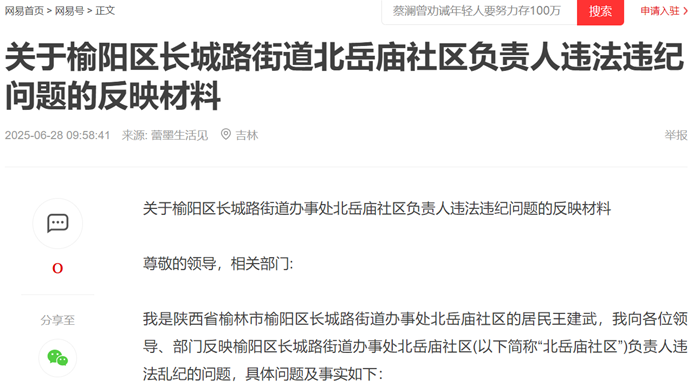 关于榆阳区长城路街道办事处北岳庙社区负责人违法违纪问题的反映材料