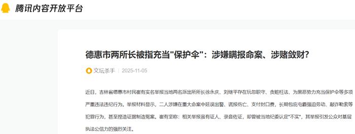 近日,吉林省德惠市村民崔有实名举报当地两名派出所所长徐永庆、刘继平存在玩忽职守、贪赃枉法、为黑恶势力充当保护伞等多项严重违法违纪行为。举报材料显示,二人涉嫌在重大命案中延误出警、谎报伤亡、支付封口费,长期包庇屯霸强迫劳动、敲诈勒索等犯罪行为,甚至捏造证据制造冤案。崔有坚称:相关举报虽有证人、录音佐证,却曾被当地纪委认定"不实",其举报引发公众对基层执法公信力的强烈关注。