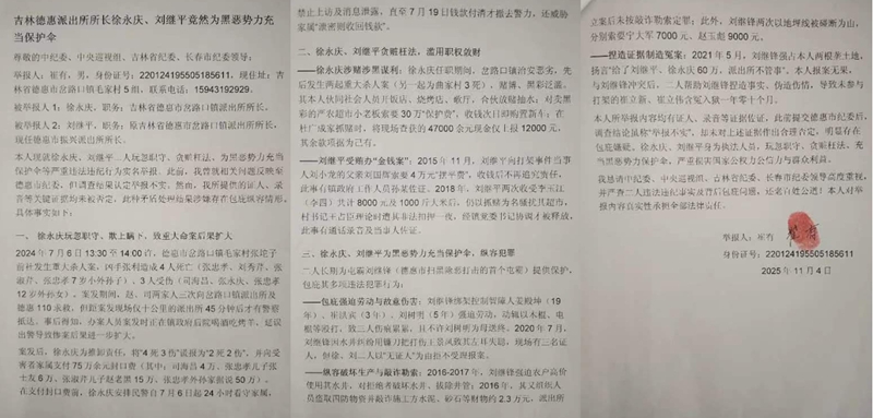 近日,吉林省德惠市村民崔有实名举报当地两名派出所所长徐永庆、刘继平存在玩忽职守、贪赃枉法、为黑恶势力充当保护伞等多项严重违法违纪行为。举报材料显示,二人涉嫌在重大命案中延误出警、谎报伤亡、支付封口费,长期包庇屯霸强迫劳动、敲诈勒索等犯罪行为,甚至捏造证据制造冤案。崔有坚称:相关举报虽有证人、录音佐证,却曾被当地纪委认定"不实",其举报引发公众对基层执法公信力的强烈关注。