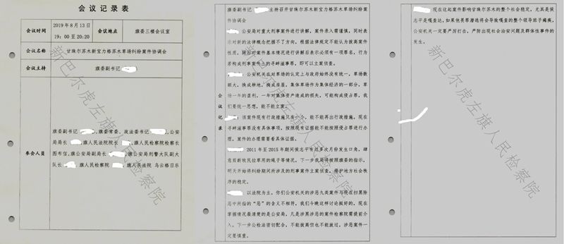 检察院卷宗中的一份会议记录显示,该领导主观推断“集体草场损失可能构成侵占罪”,号召参会人员“统一思想立案”,还无端猜测“侯志平若潜逃会导致嘎查班子瘫痪,影响社会稳定”。参会的旗公安局一位刑警大队长则坦言“对新法律概念把握不准”,却明确表示“必须有一项罪名,构成寻衅滋事罪即可立案侦查”;旗公安局一位副局长更是直接表态“按照旗委指示,明天开始立案侦查”。
